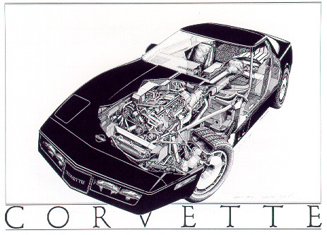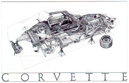 Three major "cutaway" drawings were completed in the early 80's. All are tremendously detailed and meticulously researched technical illustrations. (The "73 Corvette" shown above was done while the real car was being restored by Jay Koka in his garage. This was his slalom car containing some non-stock details.)