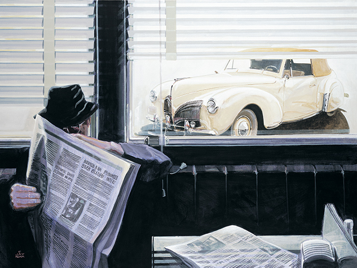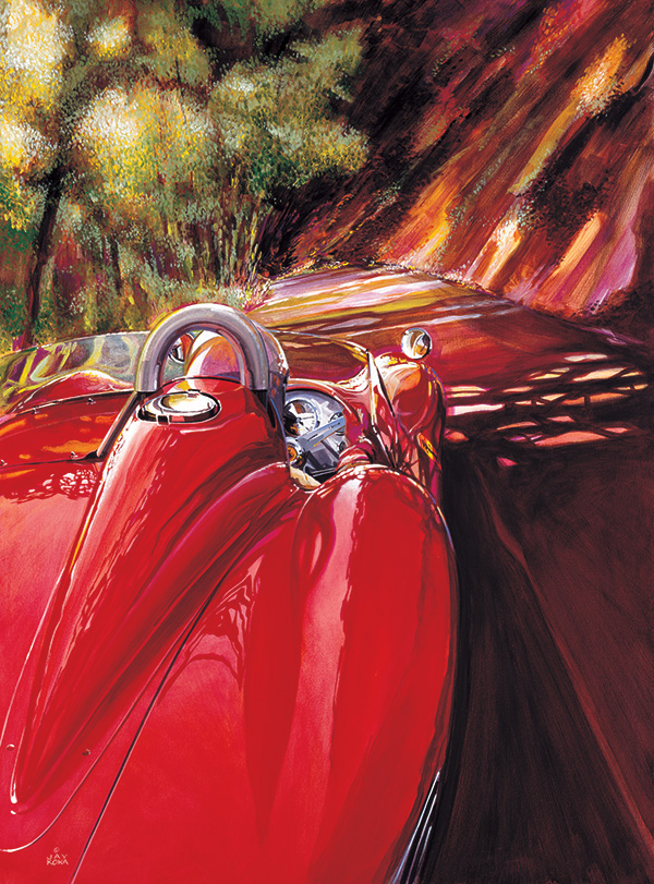This painting is more an expression of a feeling than a literal visual record of what I saw. One warm afternoon last summer (2000) I drove down this road with its steep embankments and overhanging trees that block all but small persistant patches of brilliant sunlight... I wasn't driving a Testa Rossa but the setting was magical none the less." Featuring a vintage Ferrari Testa Rossa