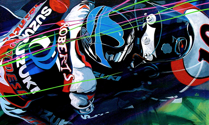 "I am a lifelong bike enthusiast or perhaps more accurately, a passionate sportbike enthusiast. My last two bikes have been a Suzuki GSXR750R ( the bike that's been ridden to two consecutive AMA Superbike Championships by Mat Mladin) as well as a Suzuki TL1000R and most recently, a Ducati 999, so I pay some attention to the bike world. The Roberts name is familiar to anyone with even a passing interest in bikes, but it's a new, young Kenny Roberts who's making a name for himself in 500 Grand Prix racing on board the awesome X89 Suzuki RGV500. My painting strives to capture the excitement and the talent of his ride."