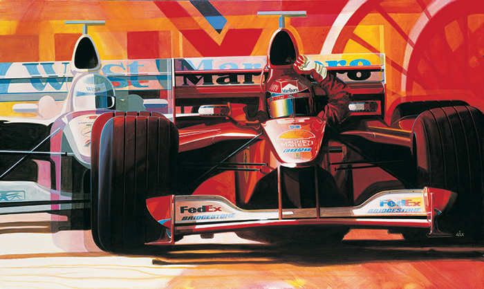 "Everyone who knows me knows that I am not a big open wheel racing fan and because of that, I do very little racing art. In fact, my last "racing" subject piece was the Ferrari 312T2 print released in 1991. These are my latest "racing art" efforts. Number 1 was to develop the idea that was fully realized in the second. I like them both."